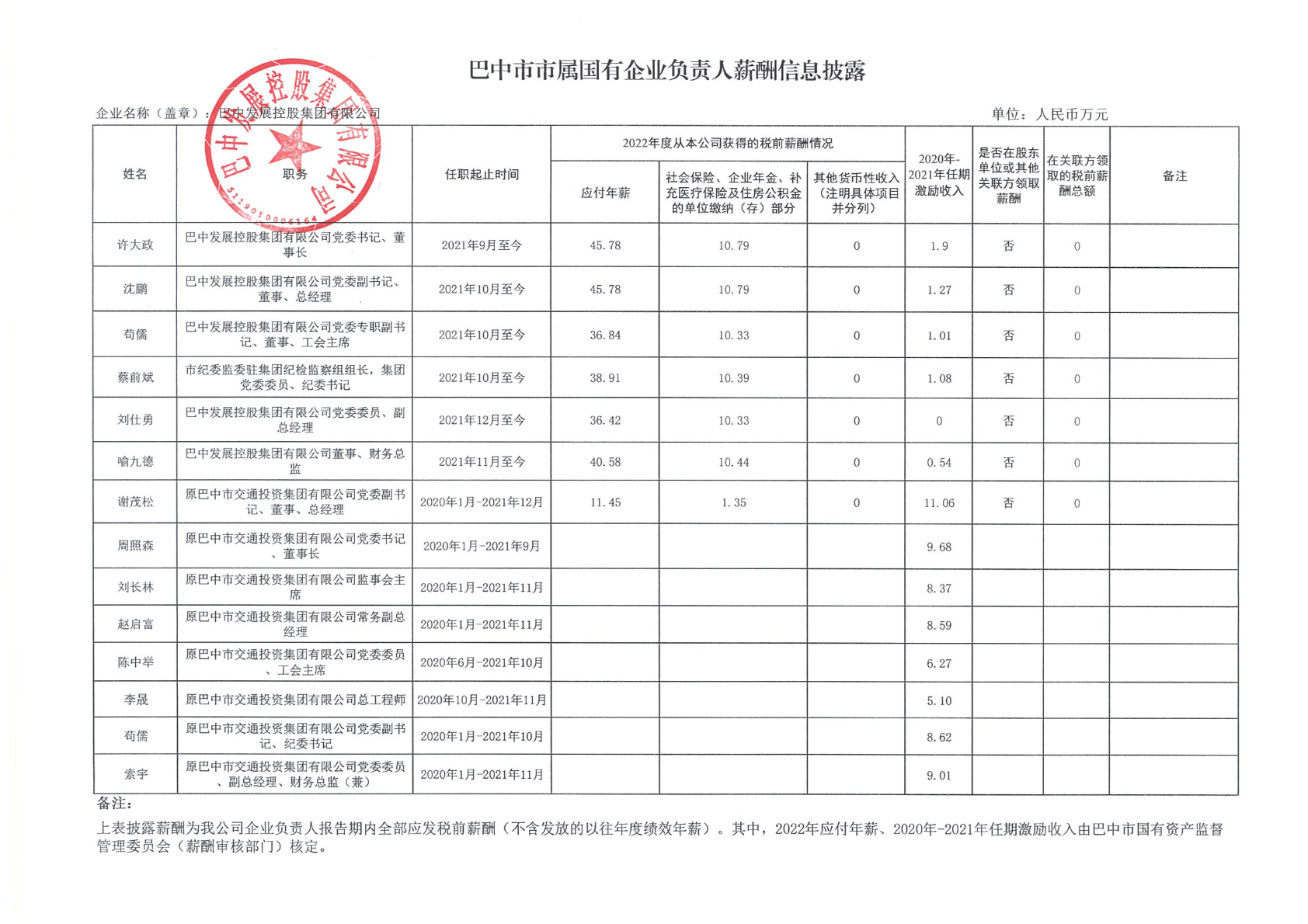 巴中市市屬國有企業(yè)負(fù)責(zé)人薪酬信息披露